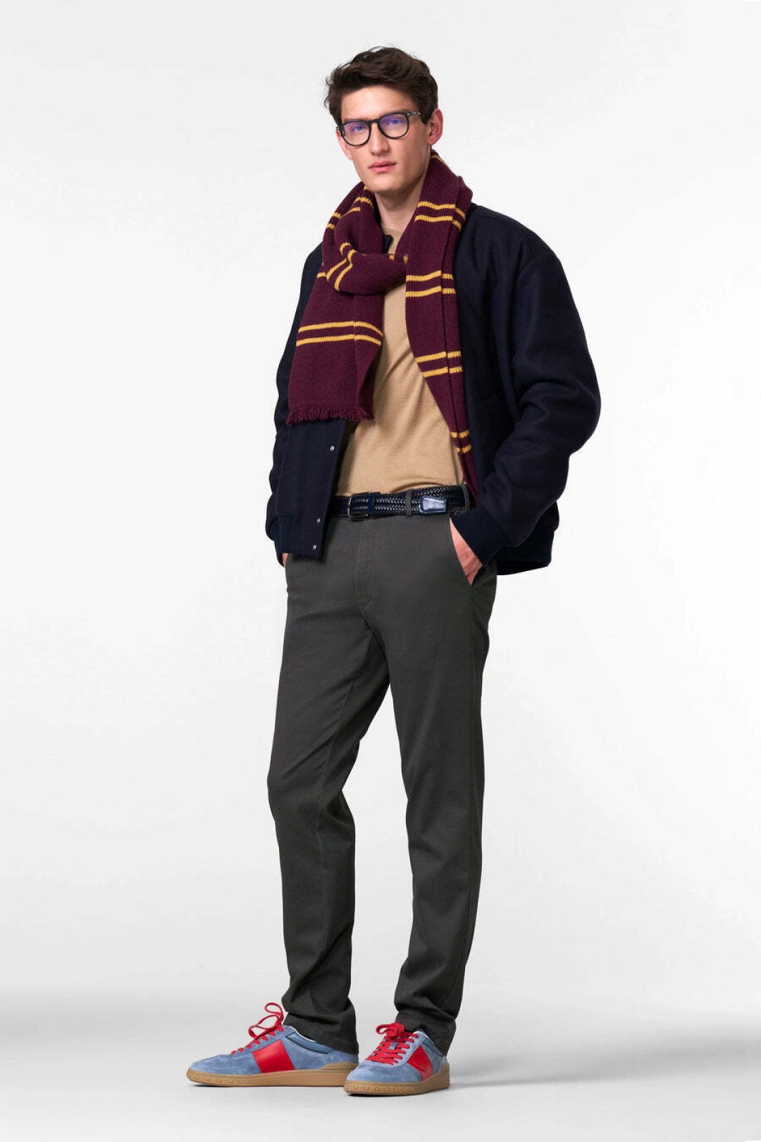 Ce chino est fabriqué de manière durable en Europe à partir de 54 % coton biologique, 44 % polyester recyclé et 2 % élasthanne, garantissant douceur, résistance et élasticité.