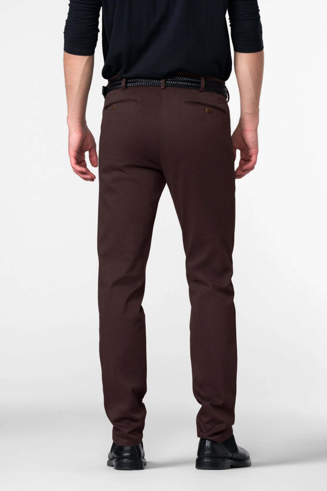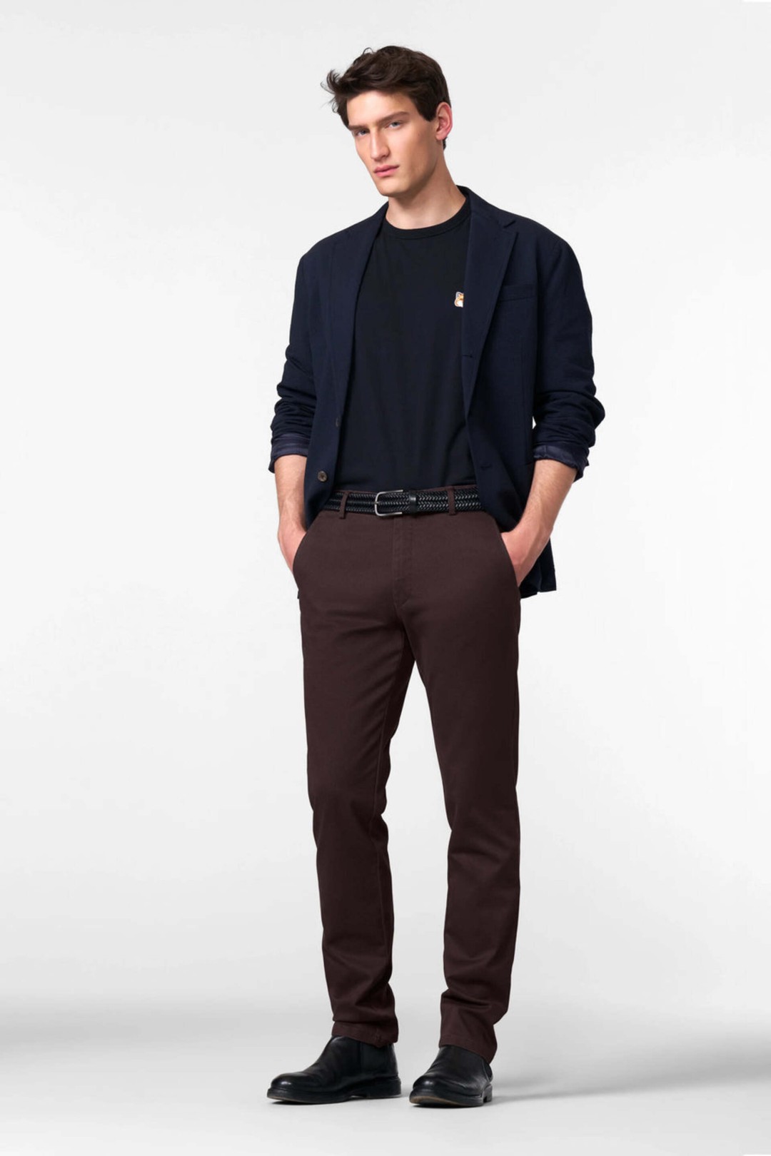 Confectionné de manière durable en Europe, ce chino est fabriqué en 54 % coton biologique, 44 % polyester recyclé et 2 % élasthanne, assurant douceur, résistance et élasticité.