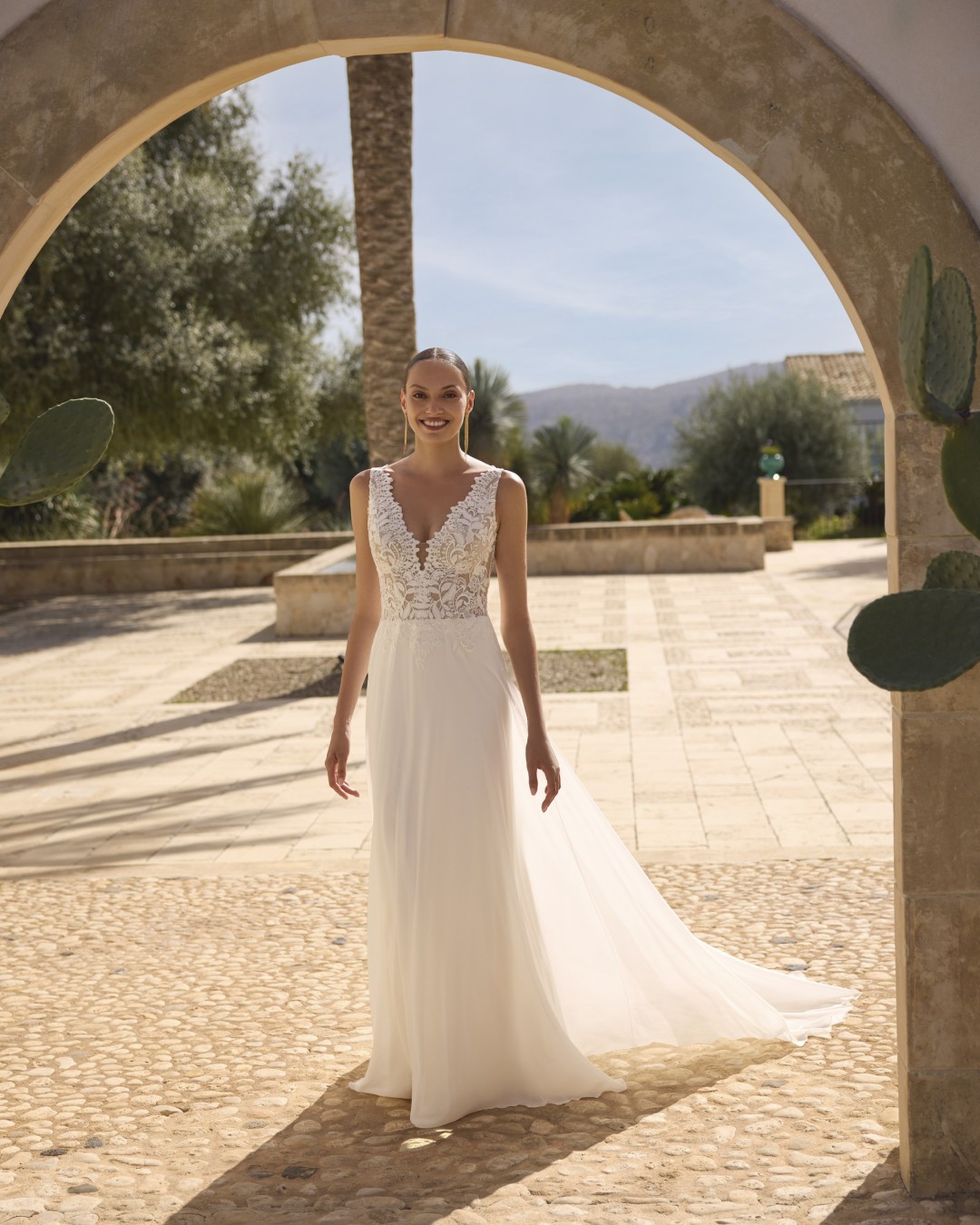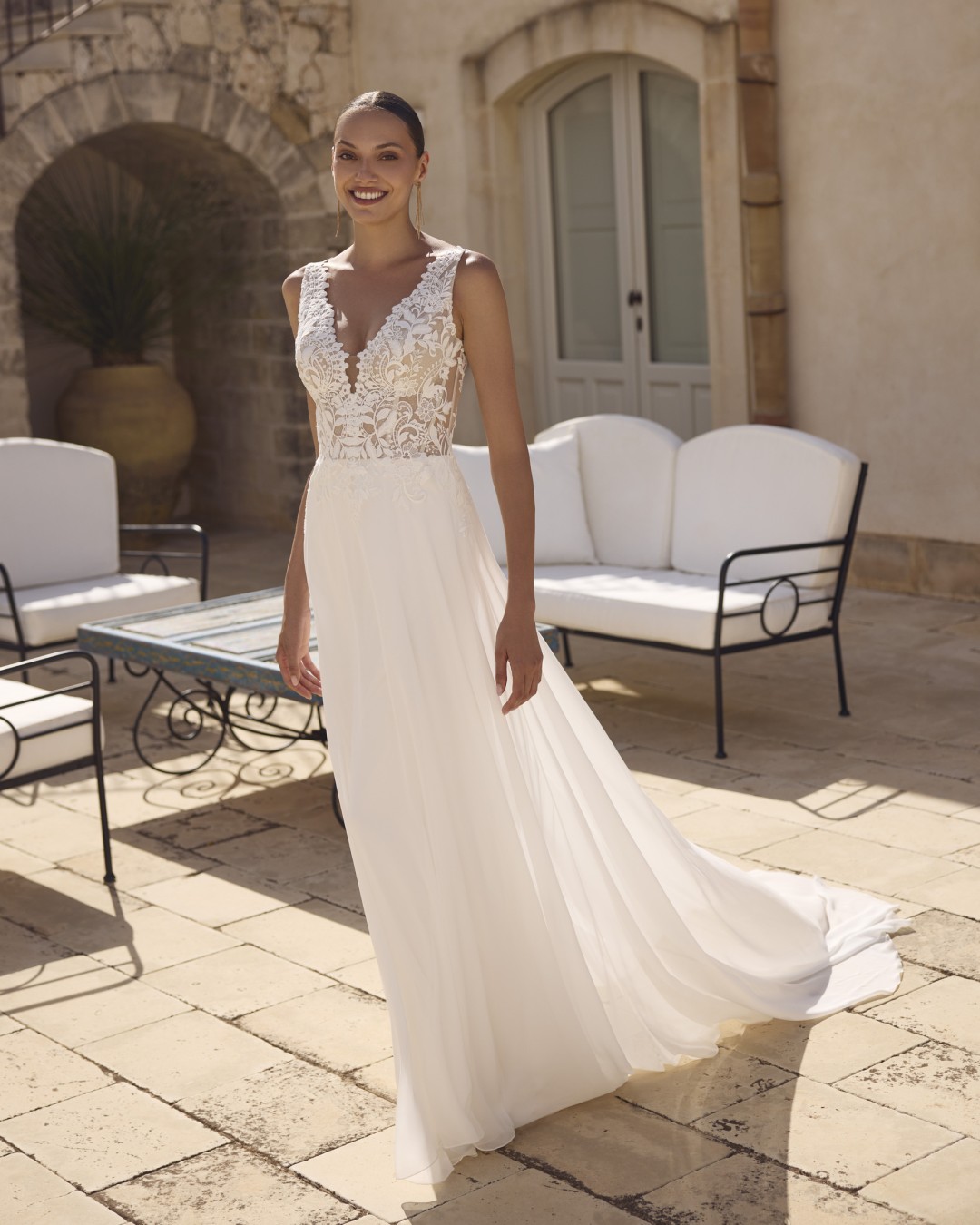 La robe Granada séduit par son esprit romantique et raffiné. Son corsage en dentelle transparente aux motifs floraux sublime le décolleté en V et la taille, tandis que le dos nu plongeant apporte une touche sensuelle et élégante. La jupe fluide en mousseline légère tombe avec grâce pour un effet aérien et naturel. Une création délicate, idéale pour une mariée moderne en quête de douceur et de féminité.