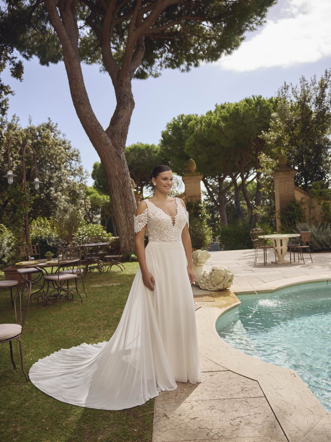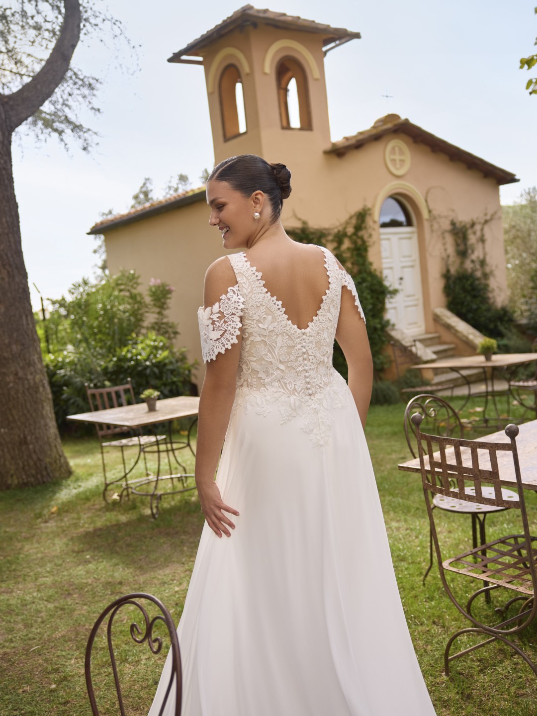 La robe Joy séduit par son esprit bohème empreint de romantisme. Son corsage en dentelle florale avec manches ajourées délicatement tombantes sublime le décolleté, tandis que sa jupe fluide en mousseline s'étire en une traîne élégante et légère. Une création raffinée qui allie confort et féminité, idéale pour une mariée libre et rayonnante.